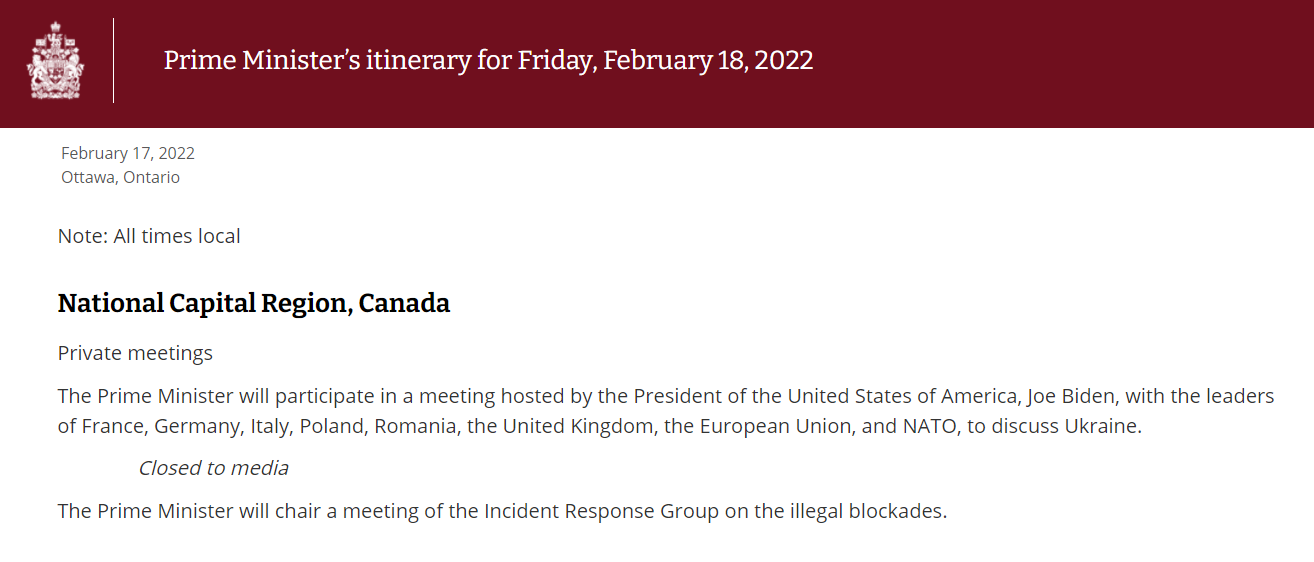 值得关注的是,在美国白宫新闻处散发的美国领导人18日行程表中,实际上未列入类似活动。加拿大总理网站上的消息称:“总理将参加由美国总统拜登组织的与法国、德国、意大利、波兰、罗马尼亚和英国、欧盟及北约领导人的会议,以讨论乌克兰问题。”