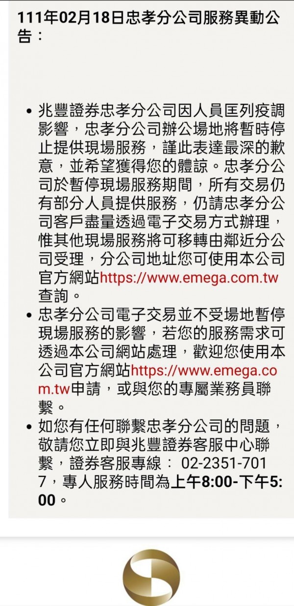 兆丰证券18日已在官网公告,忠孝分公司停业讯息,呼吁客户善用线上服务及电子下单平台,降低接触风险。若有紧急临柜需求,可由邻近分公司提供服务。