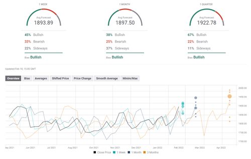 根据FXStreet Forecast的调查,金价下周可能难以延续升势。1893美元的一周均价略低于本周收盘价。从中期来看,专家中出现了看涨倾向,其中几位专家预计金价将在这段时间内升至1950美元上方。