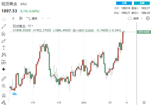 24K99讯 由于投资者对俄罗斯入侵的担忧加剧,寻求避险,黄金在本周开盘时站稳脚跟。尽管有报道称,俄罗斯军队开始重返基地,导致黄金在周二失去了作为安全避风港的兴趣,但在本周的下半部分,黄金成功恢复了势头,自2021年6月以来首次上涨到1900美元以上。周五(2月18日),随着市场情绪保持谨慎,黄金回落至1900美元下方,但本周仍强势上涨。