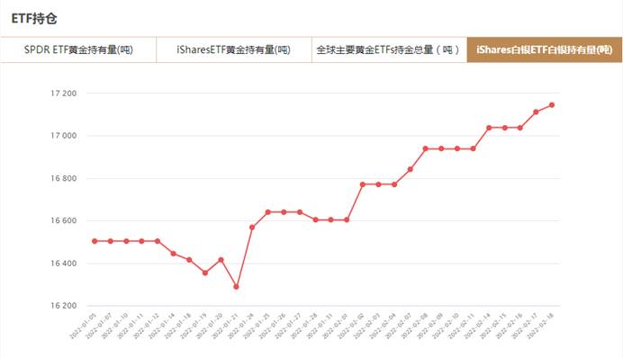 iShares白银ETF2月18日白银持有量为17145.09吨,与上一交易日增加31.62吨。