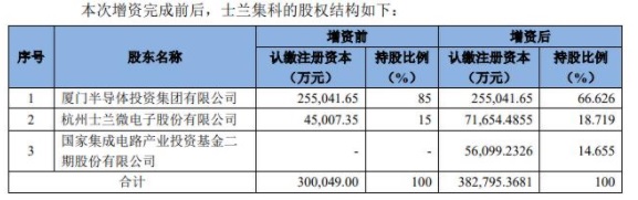 据公告,增资完成后,厦门半导体持股66.6%,士兰微持股18.7%,大基金二期持股14.7%。