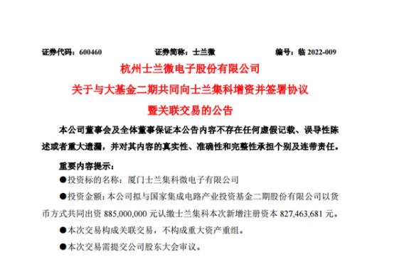 2月21日,杭州士兰微电子股份有限公司(以下简称“士兰微”)发布公告称,公司参股公司厦门士兰集科微电子有限公司(以下简称“士兰集科”)拟新增注册资本8.27亿元。本公司拟与大基金二期以货币方式共同出资8.85亿元认缴士兰集科本次新增的全部注册资本。