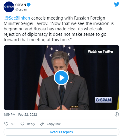 布林肯在新闻发布会上说,“现在我们看到入侵已经开始,俄罗斯已经明确表示全面拒绝外交手段,在这个时候举行会谈是没有意义的。”
