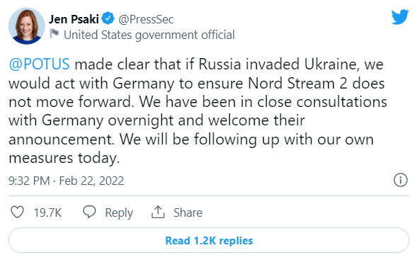 白宫新闻发言人莎琪(Jen Psaki)也在推特上暗示俄罗斯“侵略”,她在一则推文中说,“美国总统清楚表达,如果俄罗斯入侵乌克兰,我们将与德国一同行动,确保北溪-2号无法发挥作用”。北溪-2号(Nord Stream 2)是一条起于俄罗斯西北部,经波罗的海连接到德国东北部的天然气输送管线,全长约1200公里。