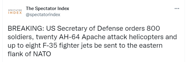 至于具体部队调动状况,一位美国国防官员指出,由800名士兵构成的步兵特遣队将从意大利调往波罗的海,F-35战机部分在波罗的海、北约东南侧翼各部署4架,32架-AH-64阿帕契攻击直升机调派20架前往波罗的海,12架前往波兰,预计本周内完成部署。