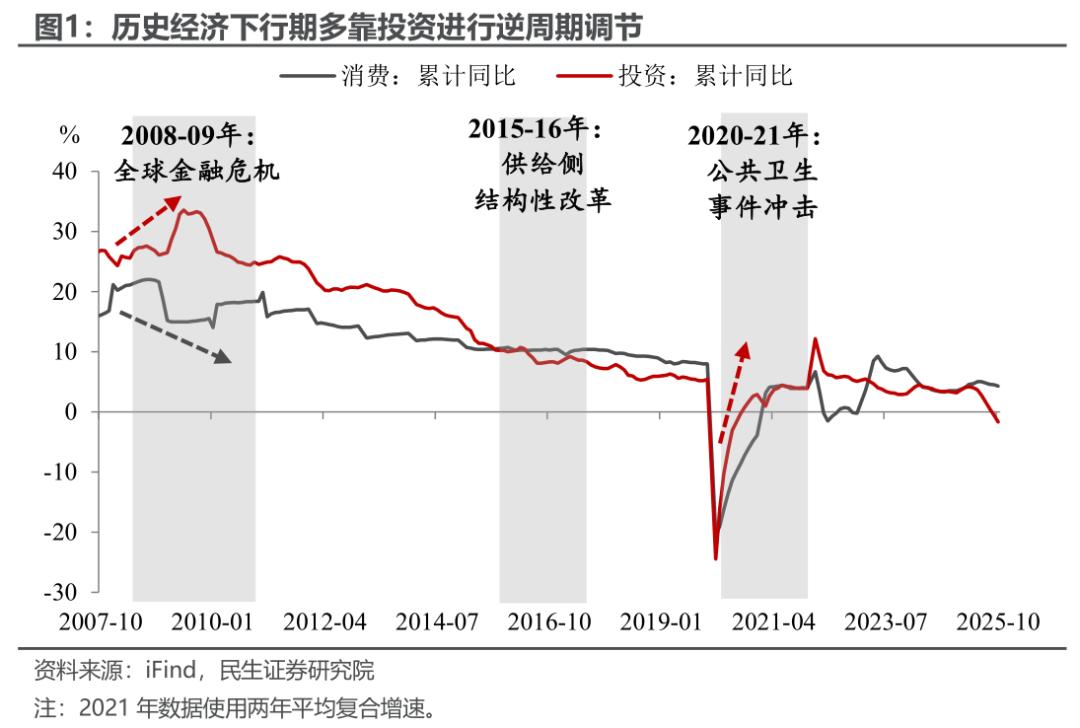 那么,稳投资还是稳消费?结合历史经验来看,除了2015-16年供给侧结构性改革这一特殊转型期外,在2008-09年全球金融危机与2020-21年公共卫生事件冲击期间,投资增速均率先反弹并引领经济企稳。