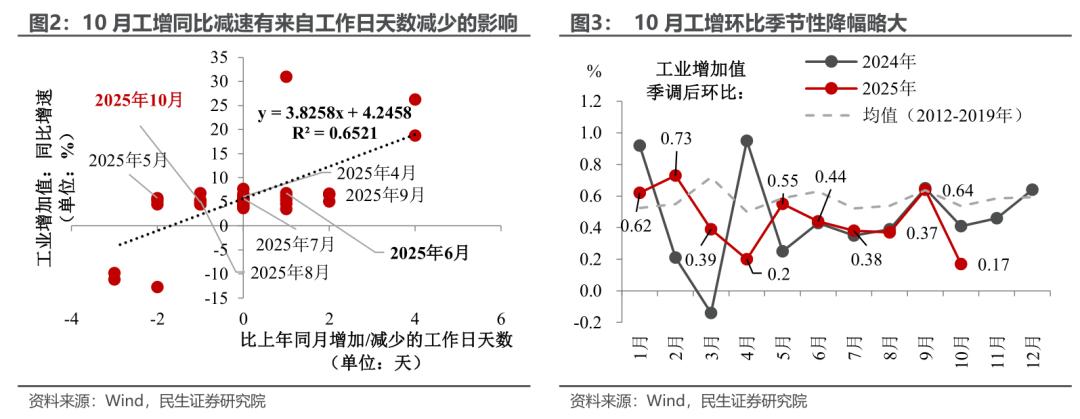 工业:“反内卷”及“稳外贸”双重压力下,工业生产放缓幅度大于季节性。无论是低景气度的制造业PMI还是增长下滑的出口,都预示了10月工业生产的放缓。同比上,工增增速从9月的6.5%放缓至10月的4.9%,有今年10月工作日比去年更少的影响;环比上,10月工增通常都会季节性放缓(受“十一”放假、工作日边际减少,以及节前部分需求已前置释放等因素影响),不过今年放缓的幅度比历史更大。