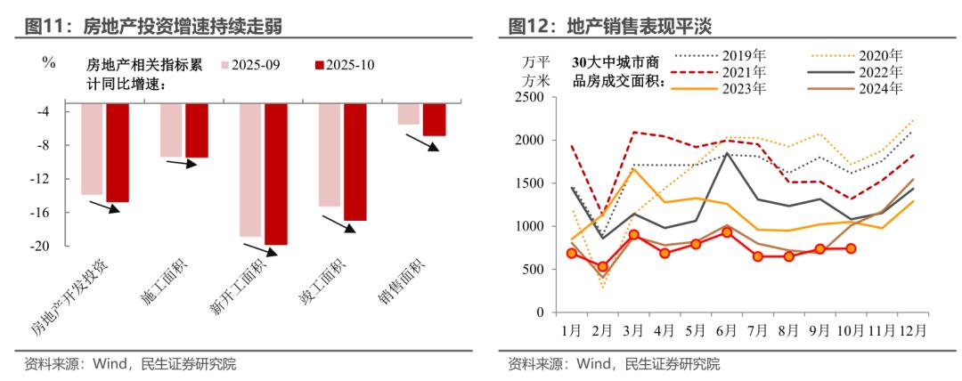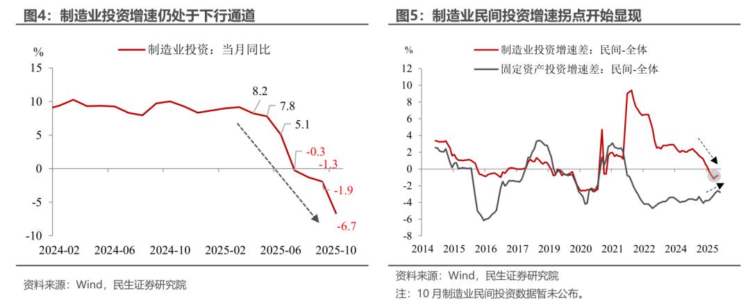 制造业:虽然增速降至2020年以来的低点,但有望在今明两年的经济过渡期中筑底企稳。自4月美国加征关税以来,制造业投资同比增速便处于下行通道,10月降幅从9月的-1.9%进一步扩大至-6.7%。当前制造业民间投资整体依旧趋弱,不过拐点开始初步显现,后续有效需求及外部不确定性的修复进度、对企业投资动能的进一步企稳至关重要。