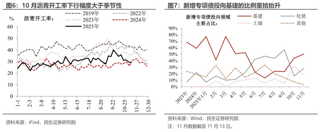 基建:在化债与增长的平衡中,基建投资正经历“减速换挡”。10月狭义基建投资增速从9月的-4.6%进一步下探至-8.9%,叠加沥青开工率超季节性回落,共同印证当前基建景气度仍处低位。考虑到今年以来财政资源持续向化解隐性债务风险倾斜,投资端的降温并不显意外。值得关注的是,近期新增专项债投向基建领域的比重已重拾升势,基建投资的拐点可能已渐行渐近。