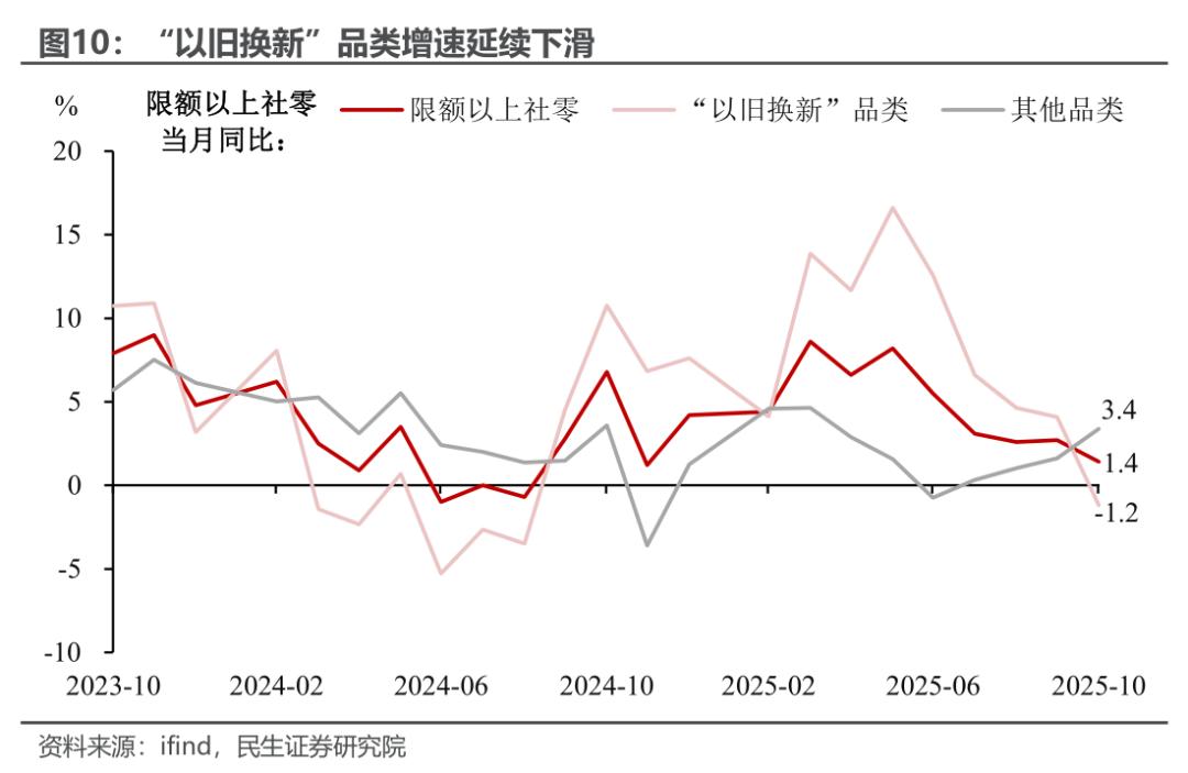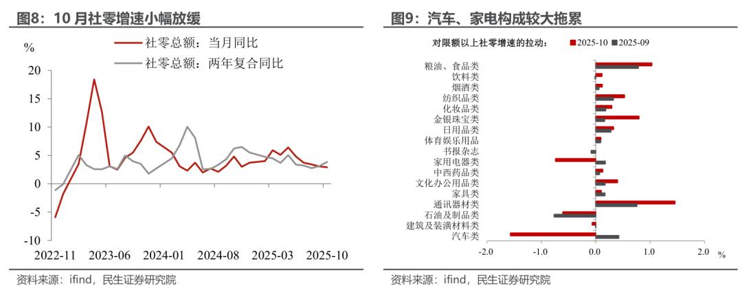 消费:社零增速小幅放缓,“双十一”前置有效对冲"以旧换新"动能减弱。10月社零增速小幅下行至2.9%,为去年8月以来的新低。究其原因,既有去年同期基数较高的影响(当月为全年增速峰值),也与“国补”政策资金消耗后“加力扩围”商品增长动能回落密切相关。