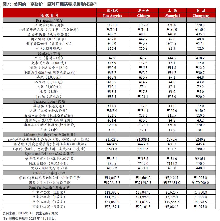 从一篮子对比数据(已统一换算为人民币)也可以看出,美国在餐饮、交通、公用事业等日常消费领域的价格水平显著高于国内。这种价格差异意味着,即便消费数量相同,以金额统计的消费规模也会被显著放大。因此,在对比中美消费数据时,必须考虑物价水平的巨大差异。