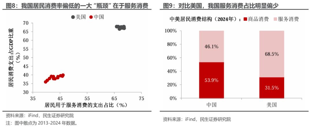 其次,服务消费成为拉开中国与发达经济体消费差距的一大“瓶颈”。2024年数据显示,我国居民服务消费占消费支出的比例为46.1%,大幅低于美国的68.5%。当然,这一差距不仅仅反映了我国服务消费市场发展尚不成熟,也揭示了现行统计体系可能带来的衡量偏差、未能完全捕捉我国实际消费活力。具体来看: