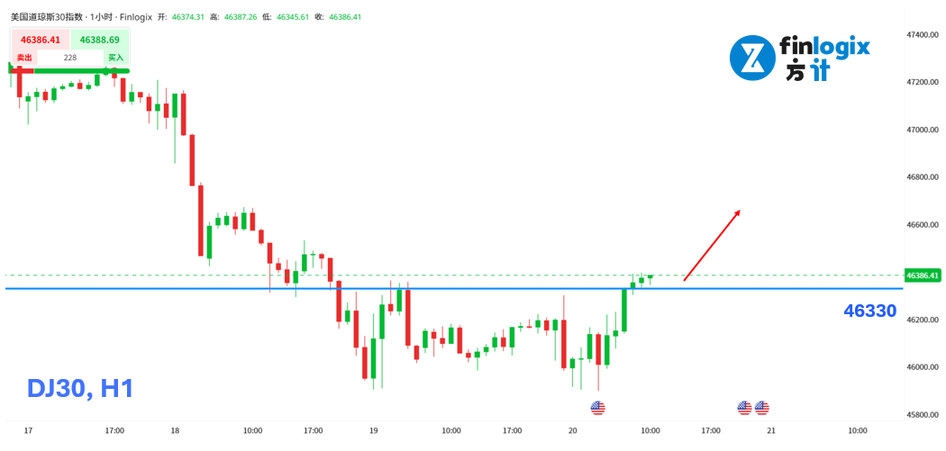 技术面:道指刚突破双底型态的颈线位置46330,有初步扭转自13日以来的下跌迹象,积极交易者可在现价考虑偏多,而保守交易者考虑修正至46200止跌再行介入。