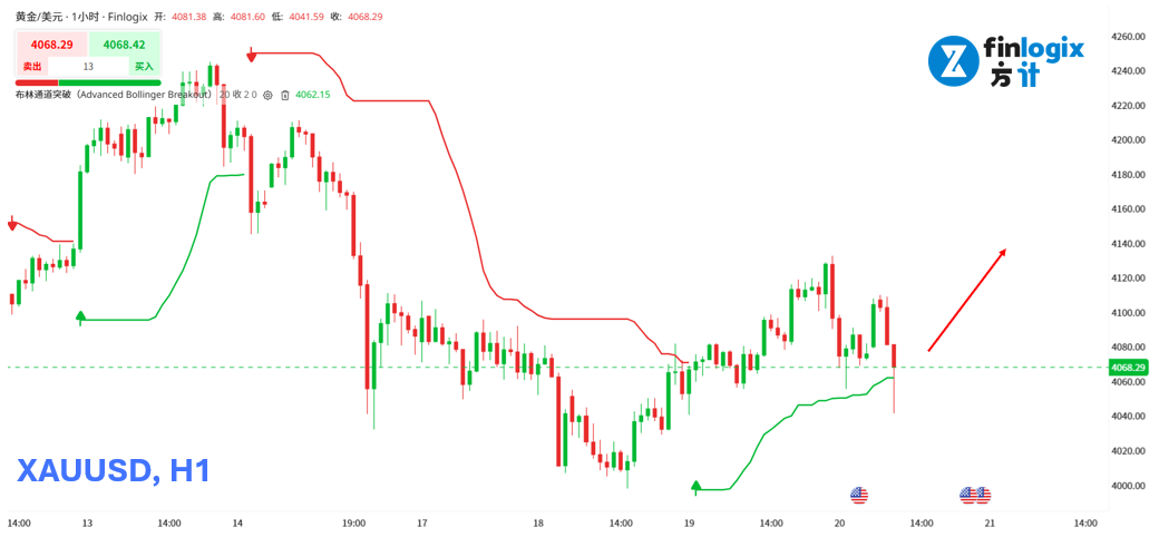 技术面:昨天黄金套用 Finlogix 独家指标「布林通道突破」时,小时图已提前出现做多讯号,目前黄金仍维持在该偏多结构中。若技术面在 4060 一带止跌企稳,将形成短线再度做多的良好切入点。另外今晚将公布 9 月非农数据,有较大概率提升12月降息预期,黄金有望借势止跌反弹,进一步强化短线多头机会。