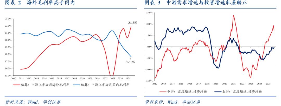 1)为何关注中游?主要是今年中游出现了四个积极的变化。一是盈利能力开始修复,ROE率先回升。二是“反内卷”更聚焦中游,或继续约束供给,从目前的中游投资与中游需求对比来看,中游率先出现投资增速低于需求增速。三是海外收入占比以及盈利占比上升,受外需影响更大,与上游或下游相比,景气独立性或更强。四是率先受益科技革命,在海外AI资本开支继续增加,国内强调科技自立自强背景下,预计同样会加大投入,中游受益(可能途径是企业设备购置投资增加或政府采购增加)。