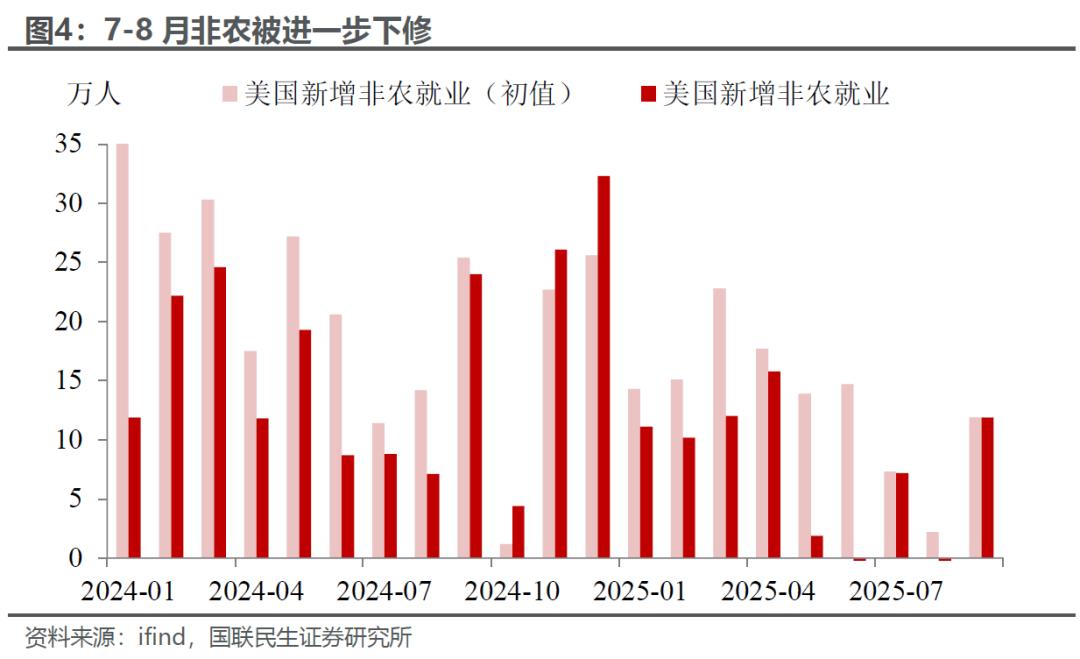 一方面,新增非农就业人数超预期上行,11.9万人的增长相当于市场预期的两倍,而这一点我们在此前报告中早已提示,前期市场对劳动力市场走弱的风险定价到极致,而9月数据由于季调方法往往有上修风险,导致降息预期回调,不过因为政府关门导致这一影响明显滞后(详见);