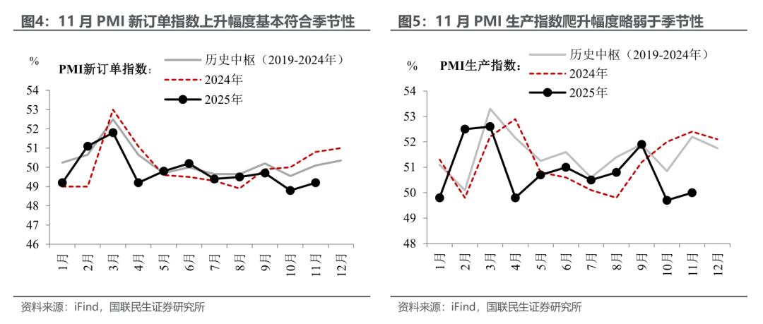 产需两端同步边际好转,但“需”更胜于“产”。11月制造业PMI的主要拉动项目,为细项数据中占比最大的PMI新订单指数及PMI生产指数。前者上升0.4pct、录得49.2%;后者上升0.3pct、录得50.0%。
