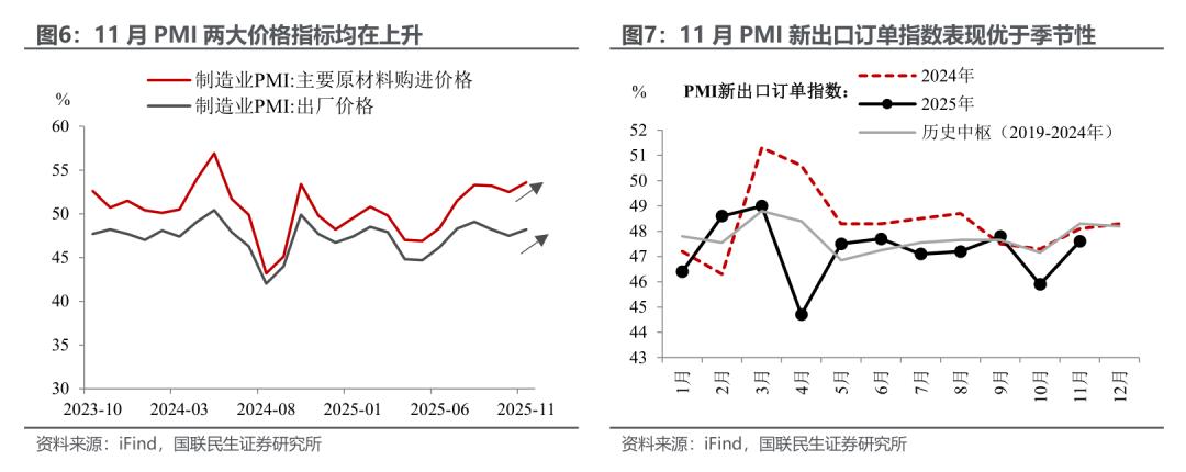 价格指标继续释放来自“反内卷”的积极信号。11月两大PMI价格指标均传达出积极信号,其中PMI原材料购进价格指数上升1.1pct、录得53.6%,PMI出厂价格指数上升0.7pct、录得48.2%,指向PPI整体增速具备继续改善的可能性。不过上游价格改善力度大于下游,意味着企业利润空间或正在收窄。