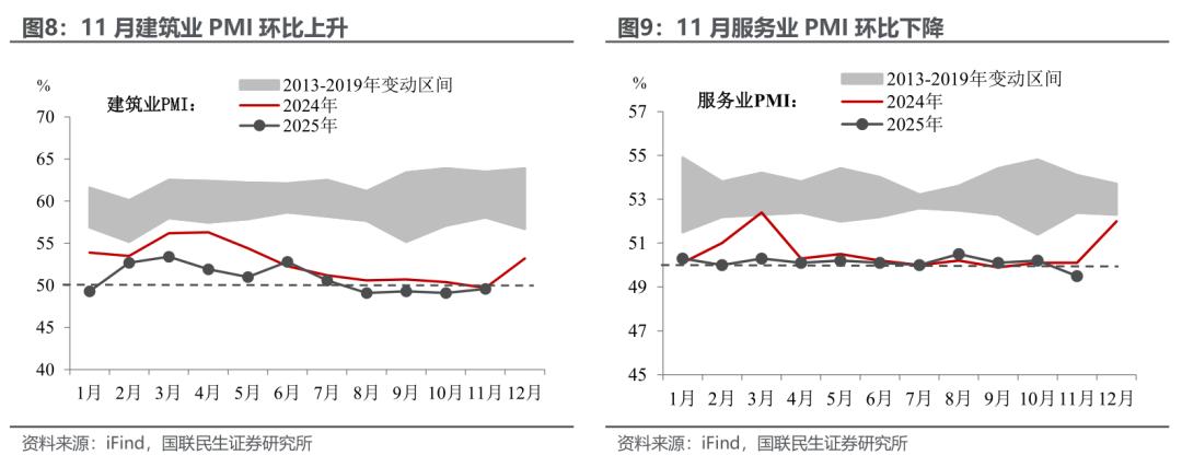 新型政策性金融工具为建筑业“加持”,而服务业更需“加一把火”。11月建筑业PMI告别6月以来的整体下行区间,环比上升0.5pct至49.6%,这也是6月以来建筑业PMI的最大增幅。不仅反映了新增专项债逐步投向实物工作量后的政策见效,更是反映了新型政策性金融工具的落地效果。相较之下,环比下降0.7pct、达到历史同期较低位置的服务业PMI略显逊色,后续亟需以更大力度推动服务消费机制的完善。